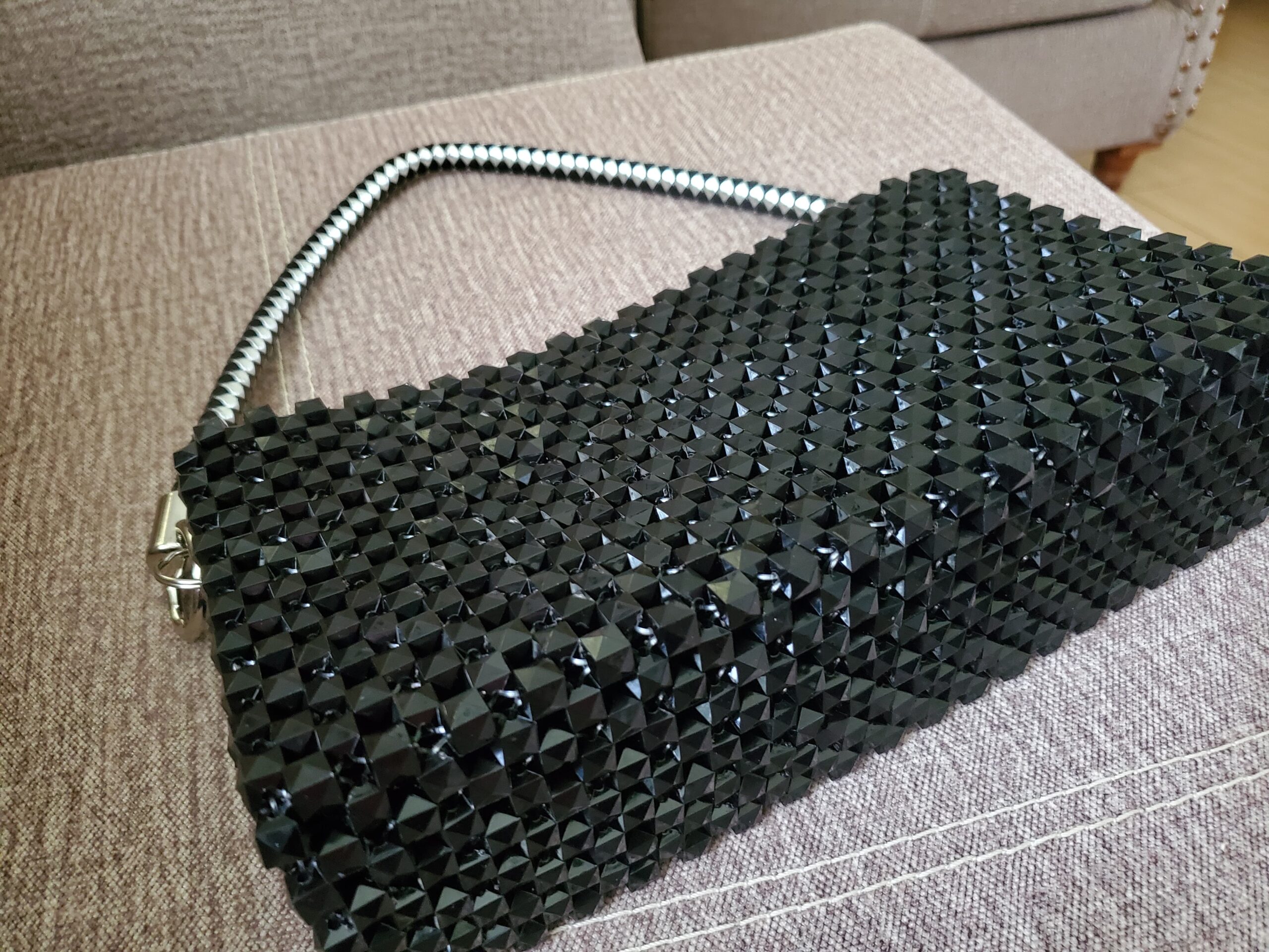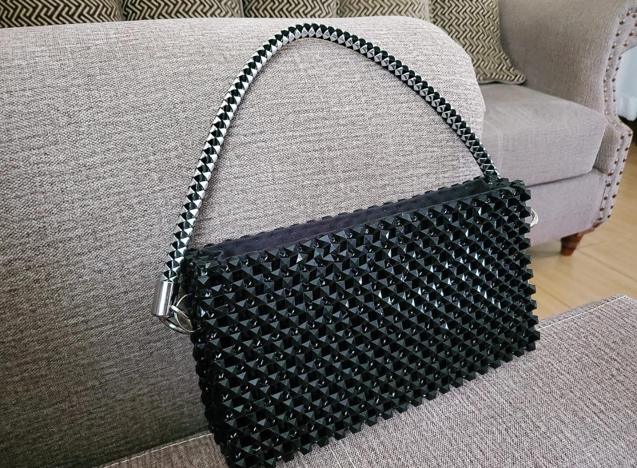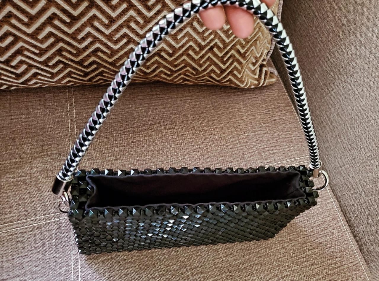 This is a black shoulder bag, its beaded with black diamond shaped beads. It comes with a leather handle that is a mix of silver and black. It dimensions are; 24cm length and 14cm height.